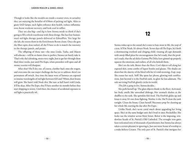 The key to Sammy’s capture and humanity’s salvation may be ten-year-old Dallas Underhill, whom Sammy temporarily adopts. Sammy himself is scientifically enhanced—with a cutting-edge cochlear implant—by which he discovers Sammy possesses superior skills that allow him to communicate with and direct other rats who have not been modified. But while Dallas and Sammy bond, time is running out for humankind: once Sammy sires his progeny, the exponential proliferation of his kind could spell the end of the world.