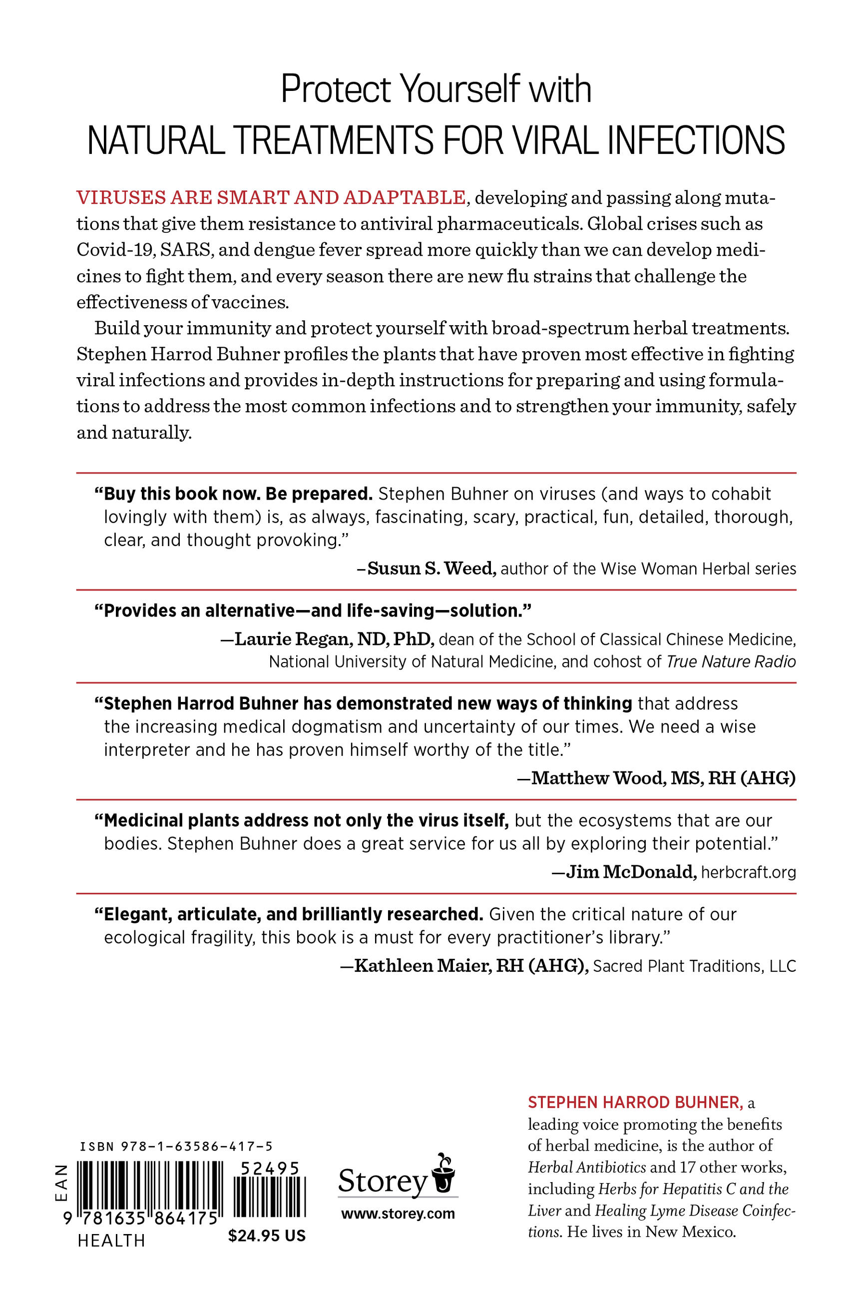 Viruses are smart, mutating, and becoming resistant to antiviral pharmaceuticals. Global crises such as COVID-19, SARS, and dengue fever spread more quickly than we can develop medicines to fight them. Herbalist and best-selling author Stephen Harrod Buhner has studied the antiviral properties of plants for many years. In this comprehensive guide, he profiles the plants that have proven most effective in fighting viral infections and provides in-depth instructions for preparing and using formulations to address the most common infections and strengthen immunity, safely and naturally. The updated 2nd edition includes an expanded guide to COVID-19, including a review of the most up-to-date medical research and the plant medicines that have been found to be most potent in preventing infection, lessening the impact of the virus on the body, and addressing longer-term effects and co-infections.