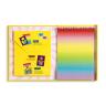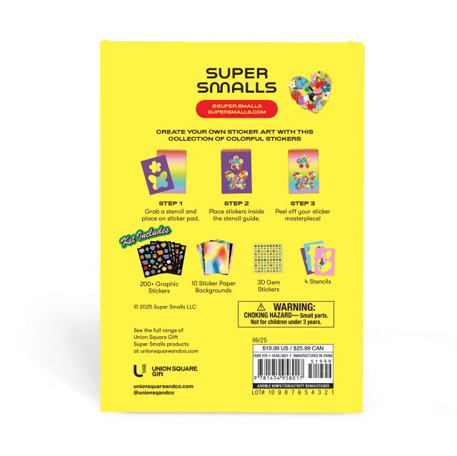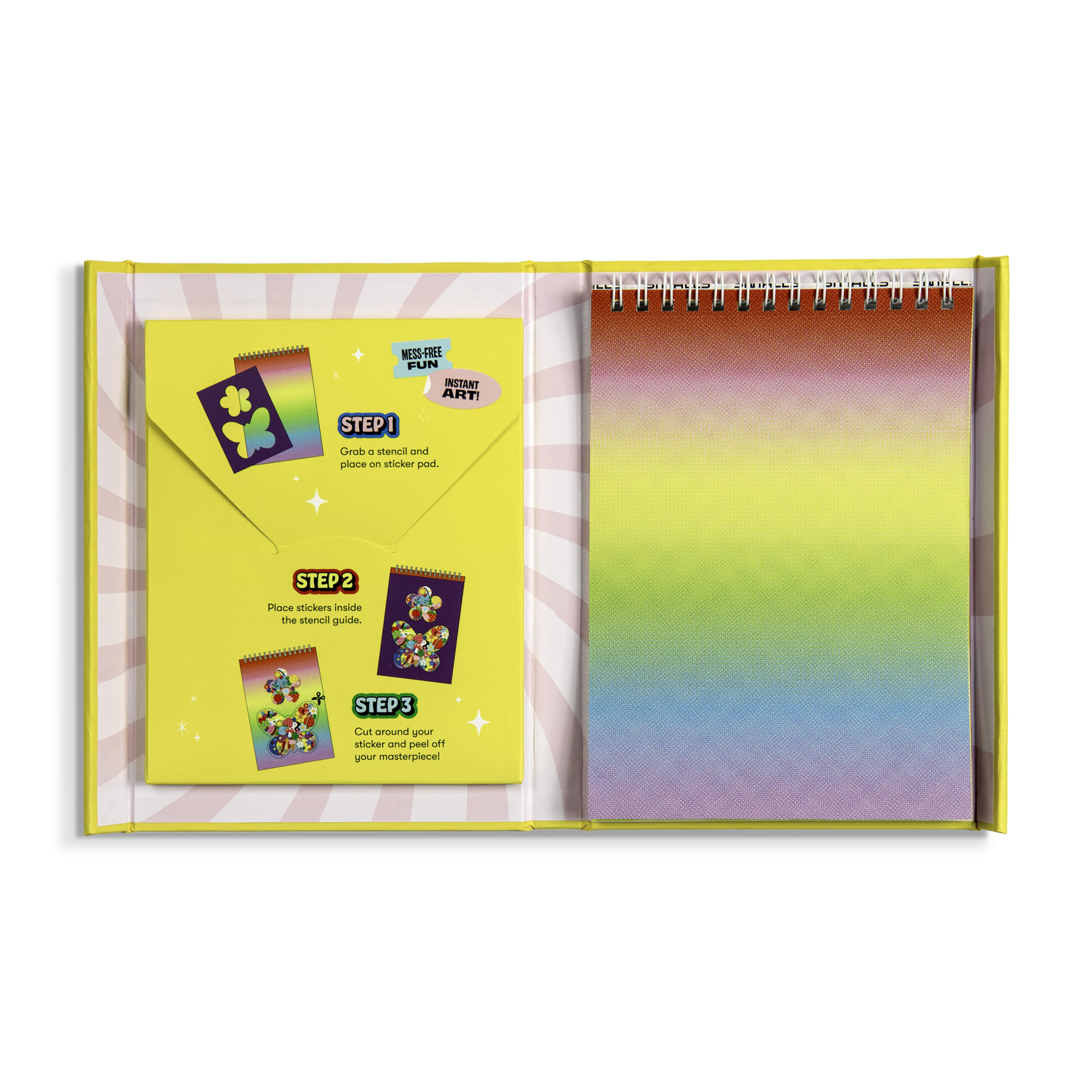 The fold-out portfolio features 10 pages of colorful sticker backgrounds on a wire-o pad. Budding child designers use a sturdy plastic stencil and the hundreds of colorful stickers and 3-D gemstone stickers to finish the designs. The finished works of art can then be peeled out of the pad and placed on any sticker-friendly surface to create unique works of art.