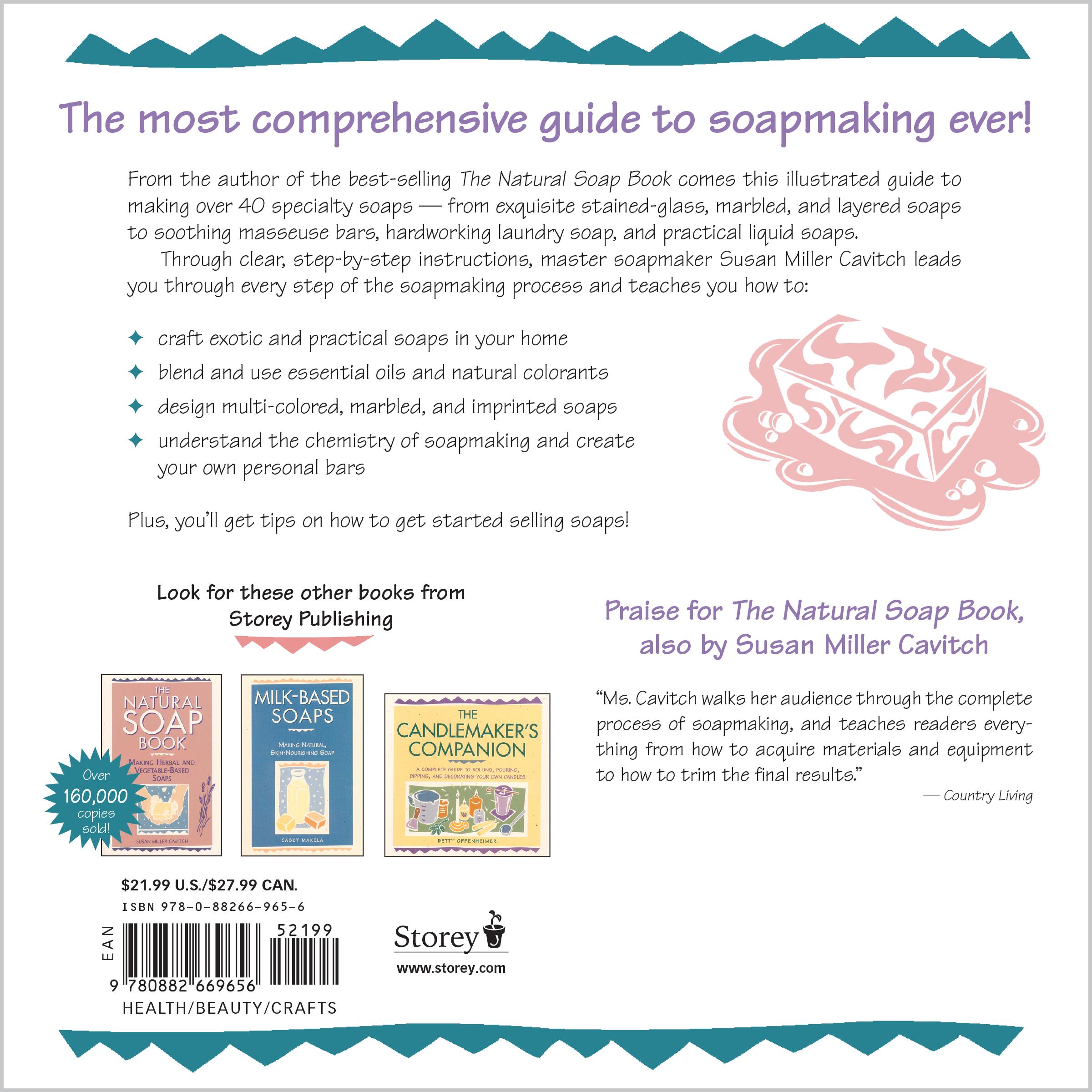 In this comprehensive guide, Susan Miller Cavitch covers everything you need to know to make your own soaps. Learn the basic techniques for crafting oil-, cream-, and vegetable-based soaps, and then start experimenting with your own personalized scents and effects. Cavitch provides tips for making more than 40 different specialty soaps, showing you how to design colorful marbled bars and expertly blend ingredients to create custom fragrances. You’ll soon be making luxurious soaps at a fraction of the cost of boutique products.