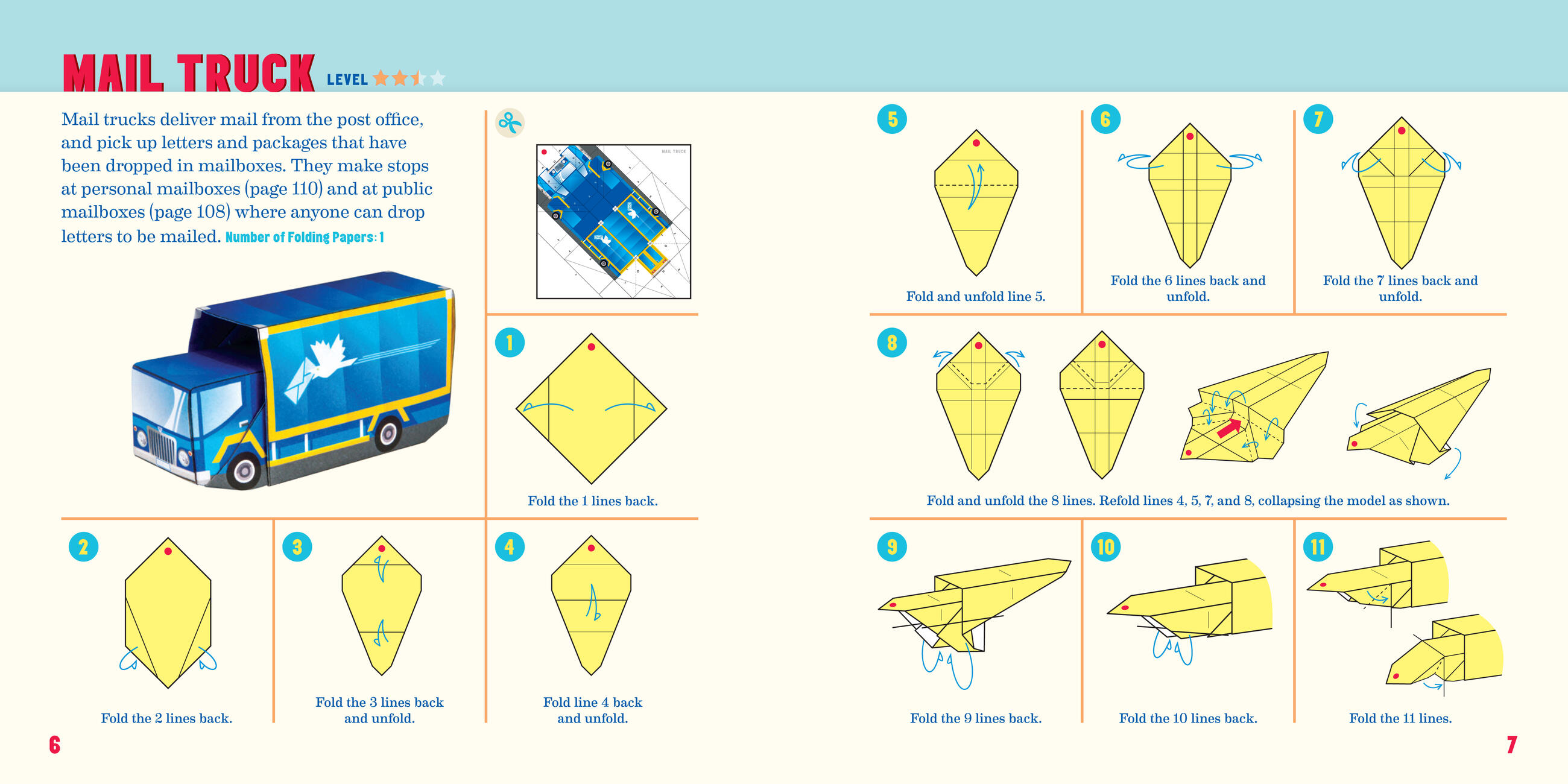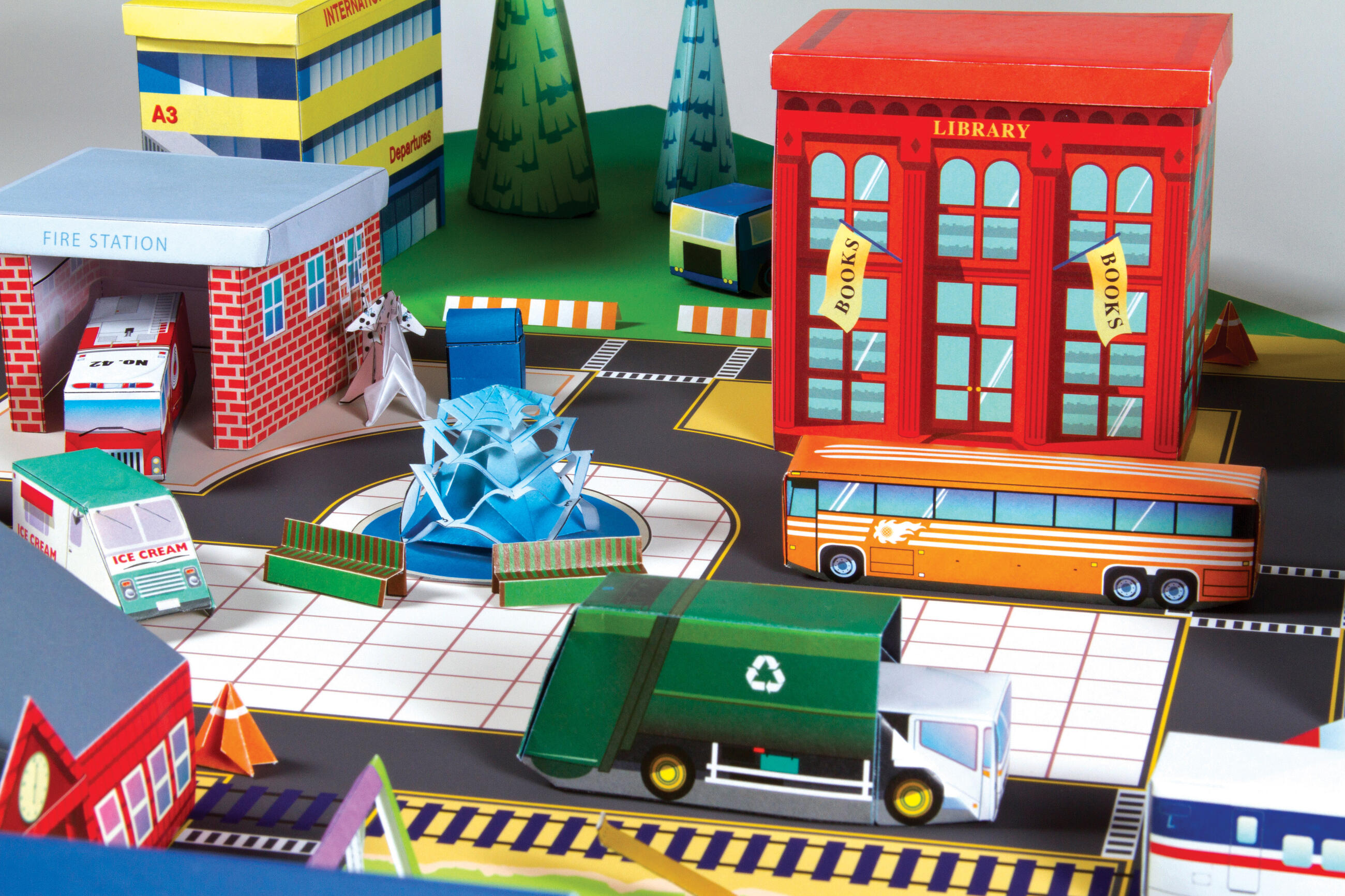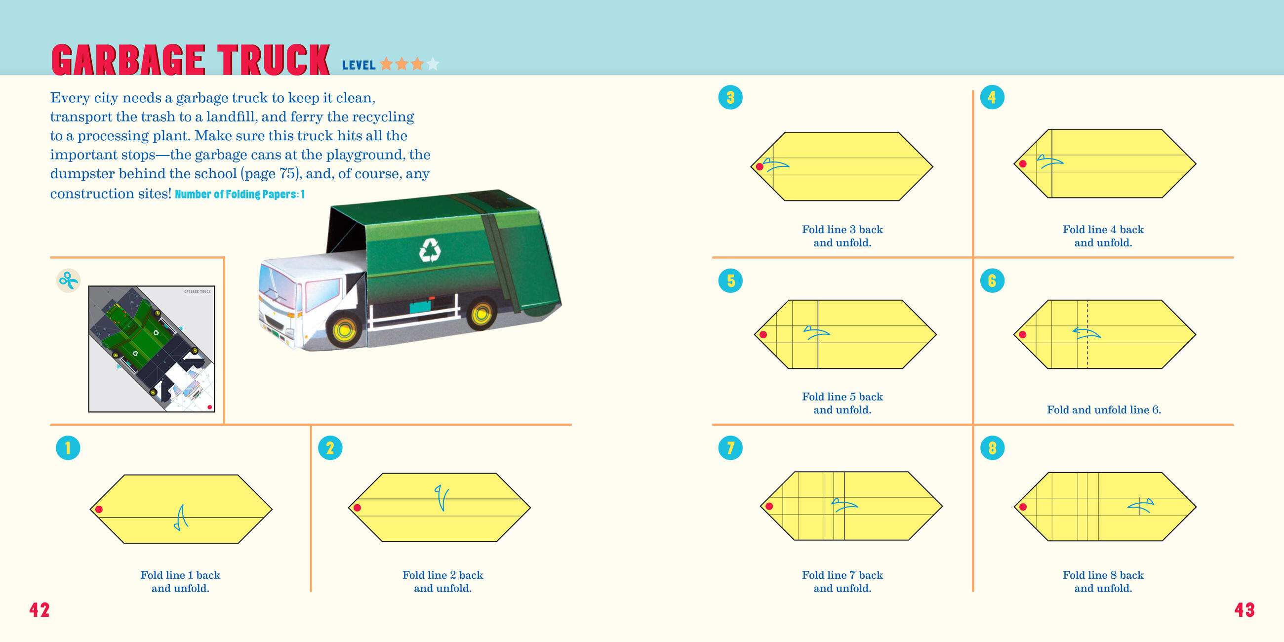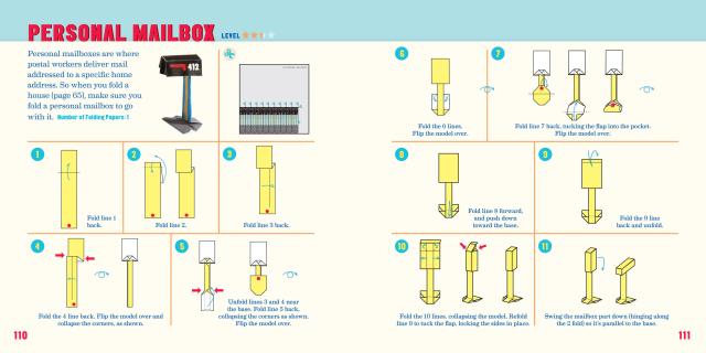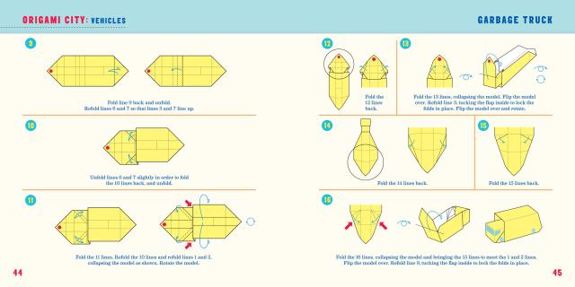 The kit includes 75 models to fold (with step-by-step instructions), 104 sheets of specially printed origami paper with numbers and lines for folding, and a full-color foldout play mat with roads and more.