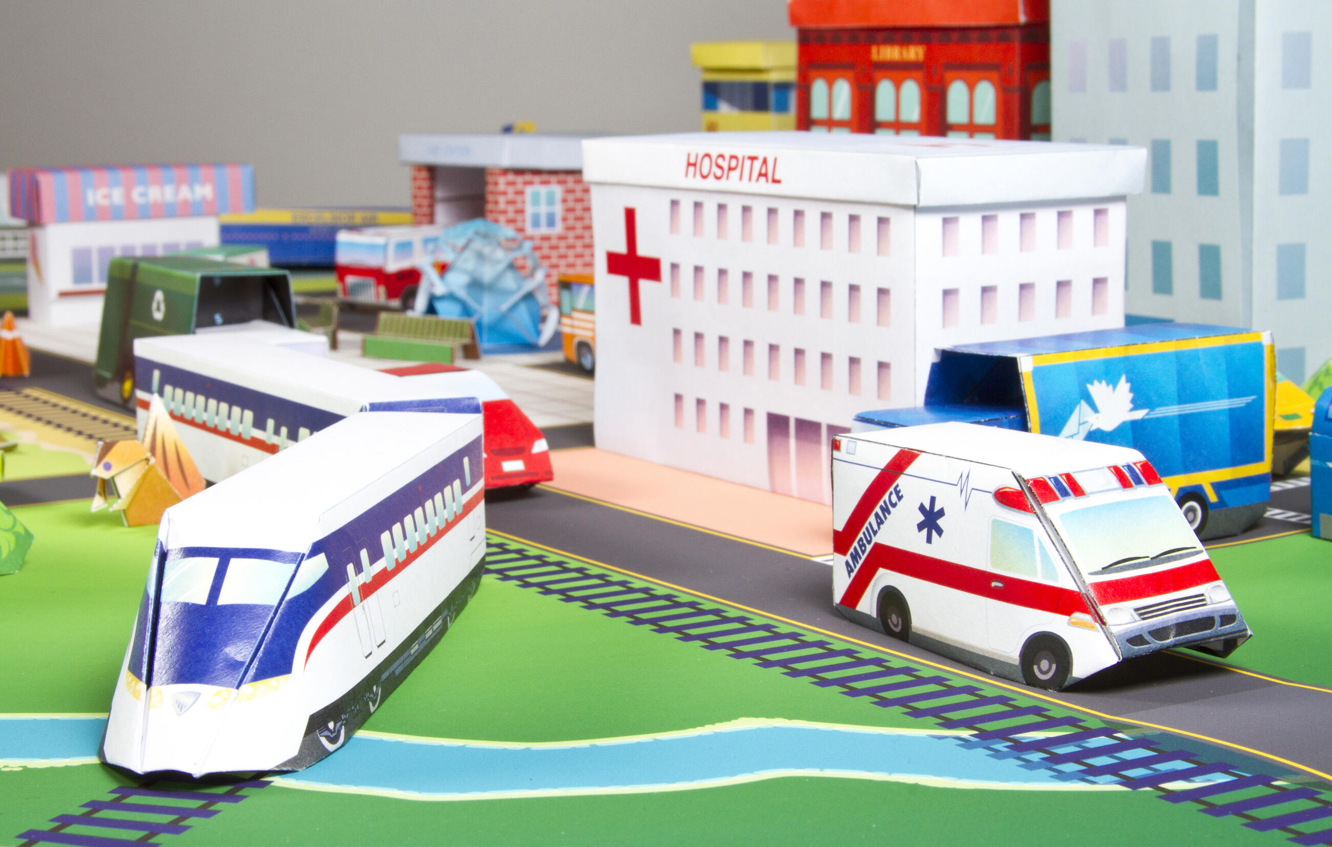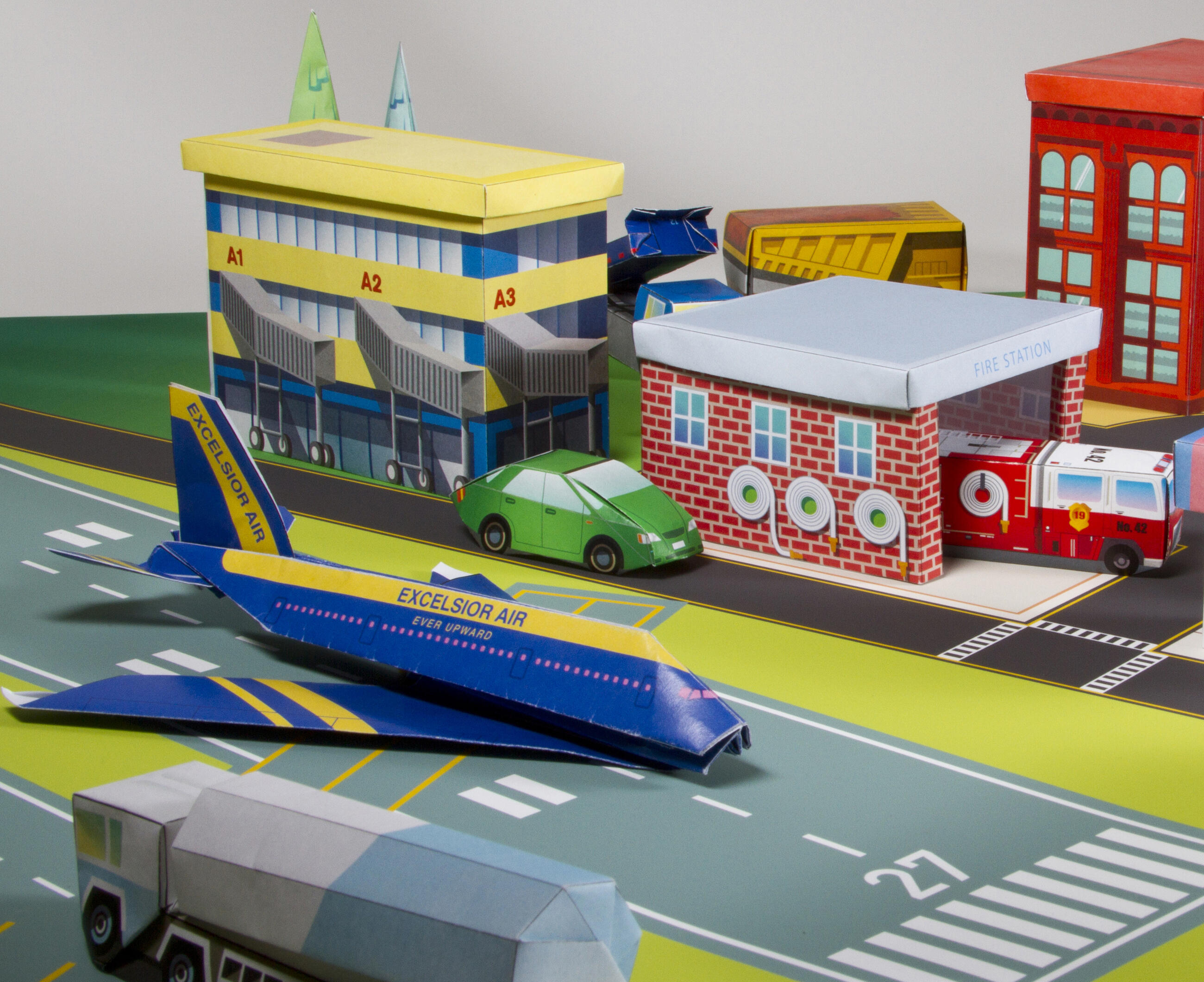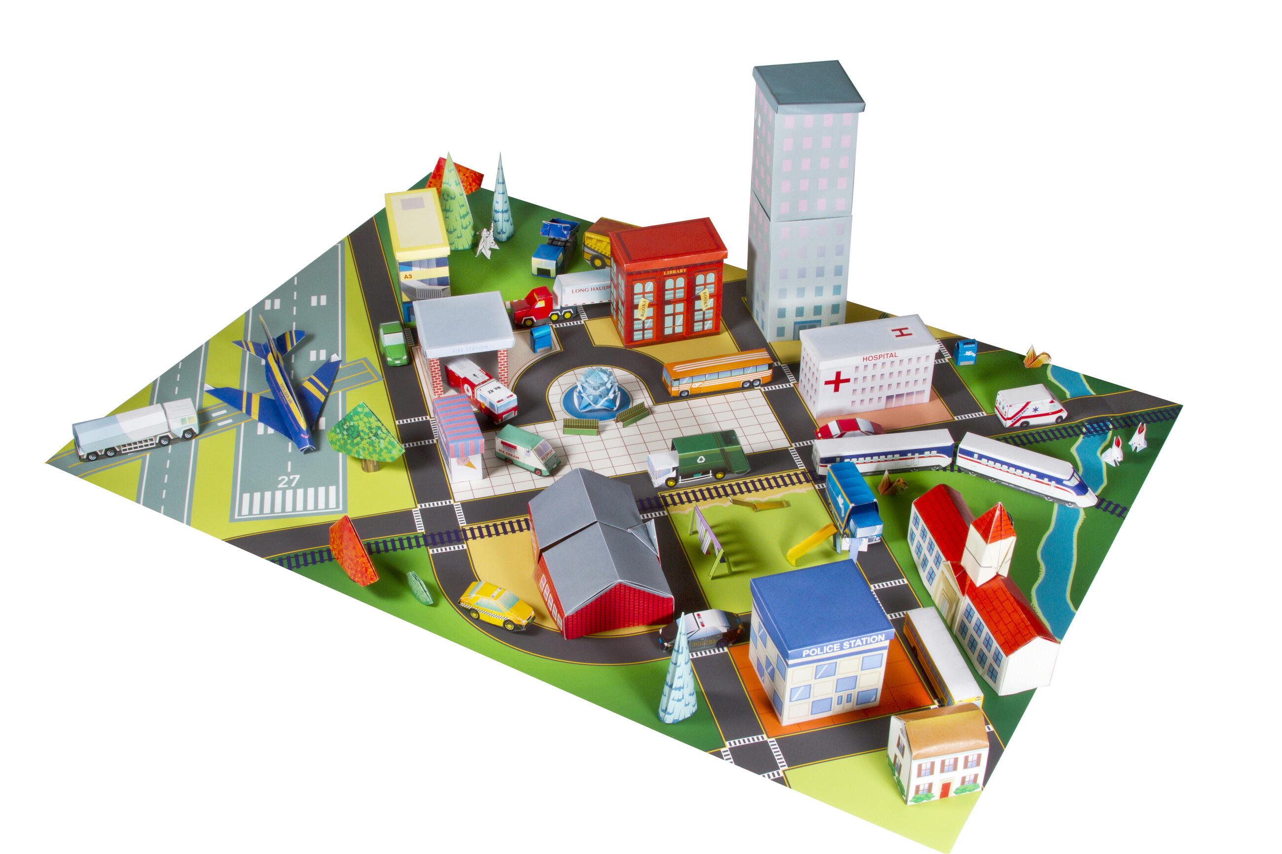 The kit includes 75 models to fold (with step-by-step instructions), 104 sheets of specially printed origami paper with numbers and lines for folding, and a full-color foldout play mat with roads and more.