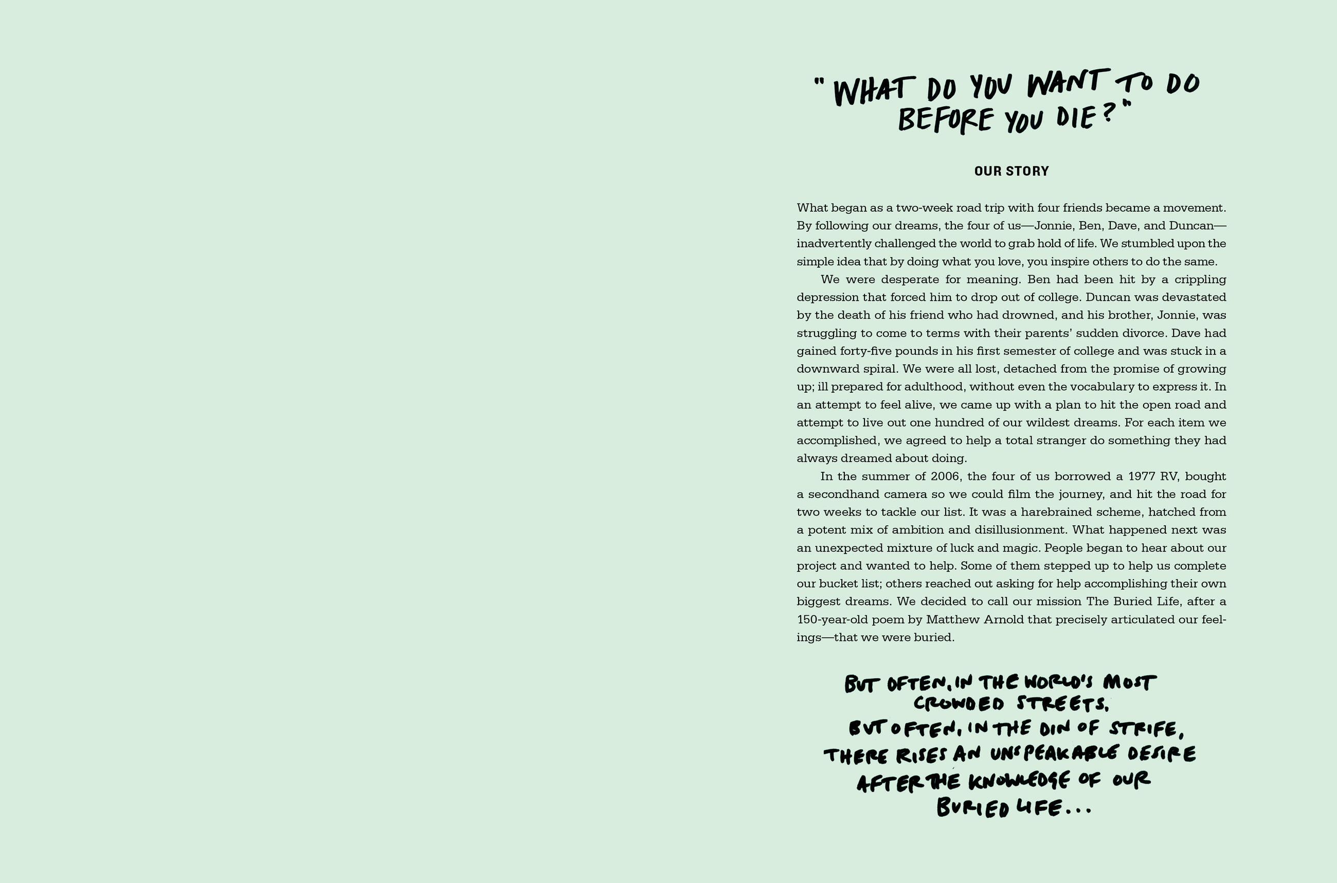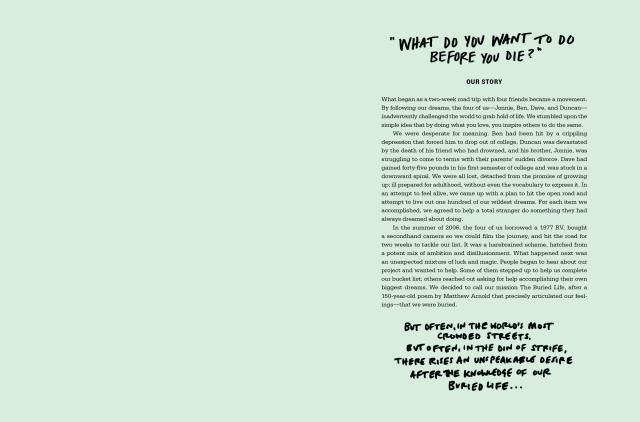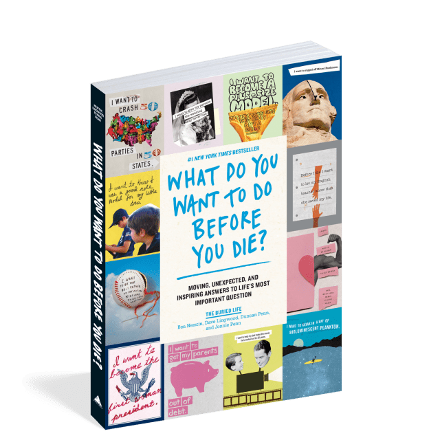 What Do You Want to Do Before You Die? is an illustrated collection of your wildest dreams. Two hundred of the most moving, imaginative, unexpected, and inspiring things to do before you die are brought to life through handmade art curated by Ben, Dave, Duncan, and Jonnie—the founders of The Buried Life.