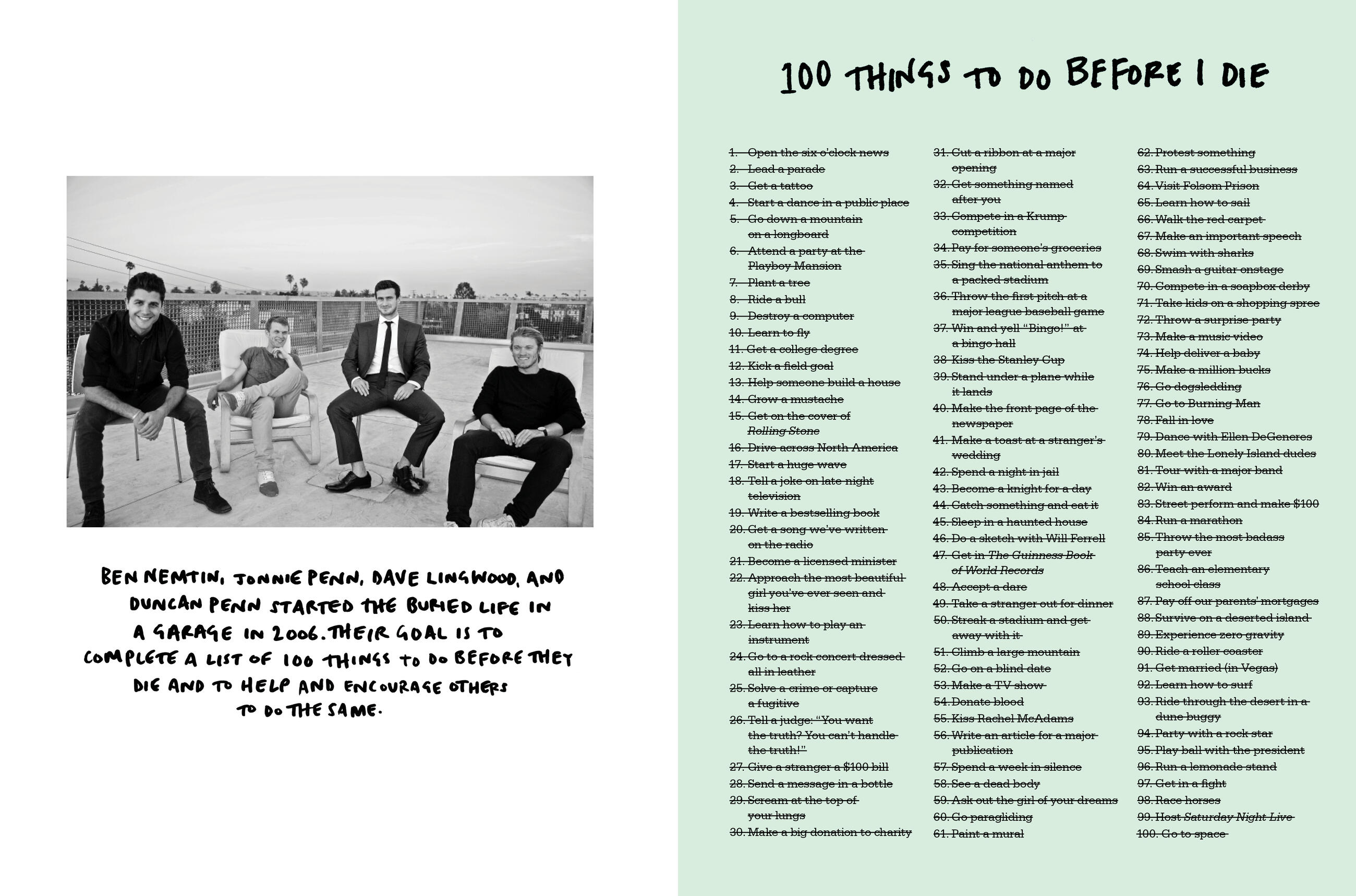 These four regular guys are on a mission to complete a list of 100 things before they die, and for every item they accomplish, they help a total stranger do something on his or her own list.