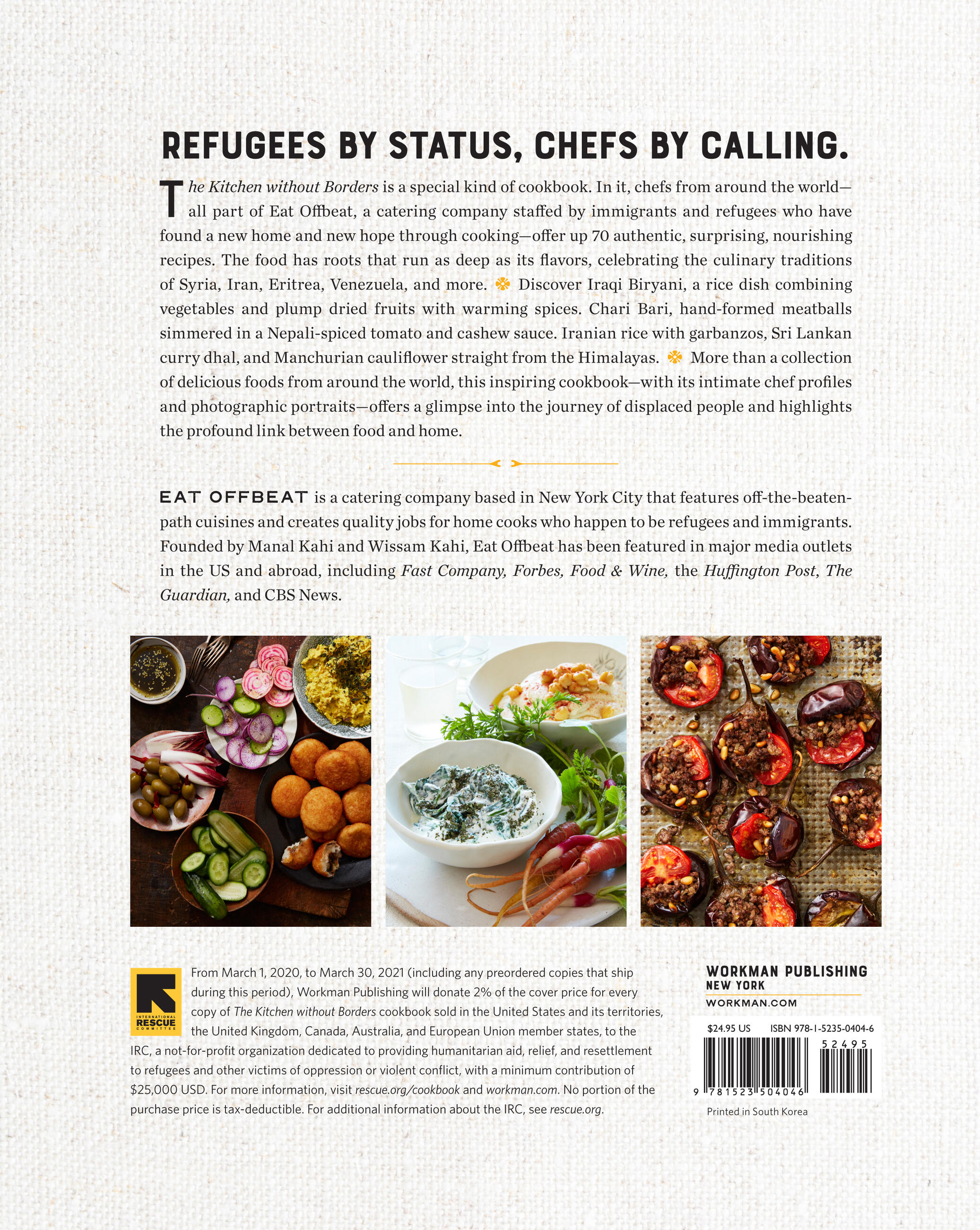 *From March 1, 2021, to March 1, 2022, (including any preordered copies that ship during this period), Workman Publishing will donate 2% of the cover price for every copy of The Kitchen without Borders cookbook sold in the United States and its territories, the United Kingdom, Canada, Australia and European Union member states, to the IRC, a not-for-profit organization dedicated to providing humanitarian aid, relief and resettlement to refugees and other victims of oppression, conflict, or disaster with a minimum contribution of $25,000 USD. For more information, visit rescue.org/cookbook and https://www.workman.com/kwob. No portion of the purchase price is tax-deductible. For additional information about the IRC, see rescue.org.