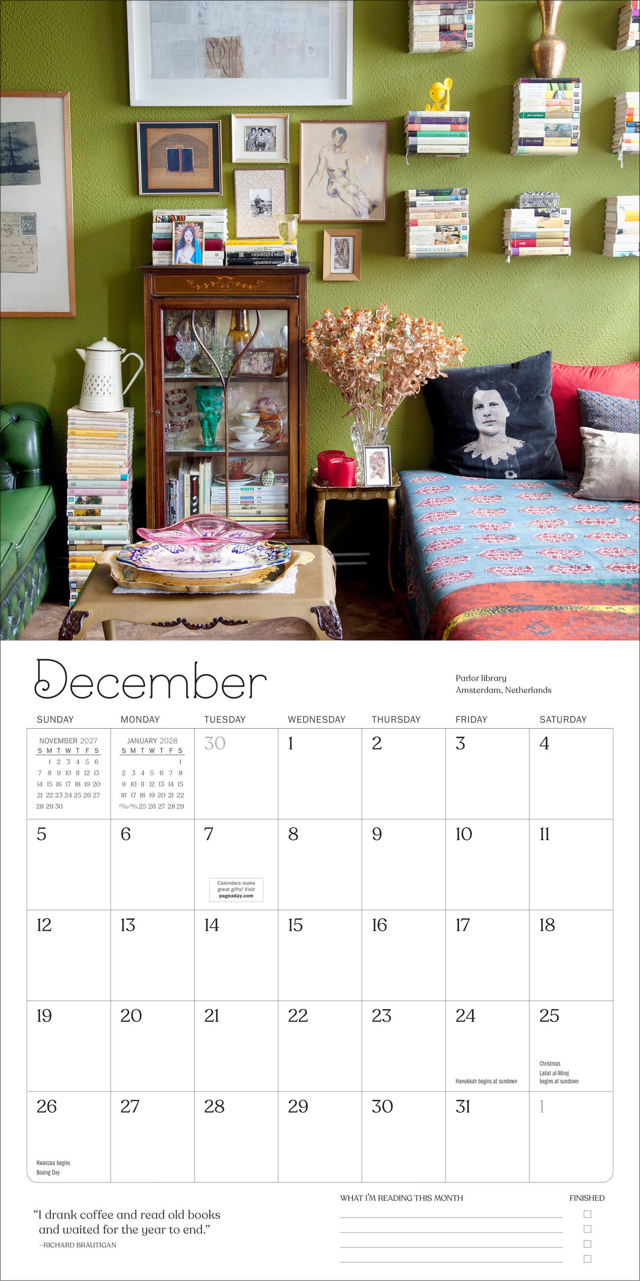 - BOOKISH BEAUTY: Each month highlights places dedicated to books, from grand libraries to cozy bookstores. Gorgeous photography is paired perfectly with quotes about the joys of books and reading.