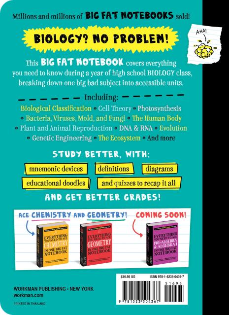 This Big Fat Notebook covers everything you need to know during a year of high school BIOLOGY class, breaking down one big bad subject into accessible units. Including: biological classification, cell theory, photosynthesis, bacteria, viruses, mold, fungi, the human body, plant and animal reproduction, DNA & RNA, evolution, genetic engineering, the ecosystem and more.