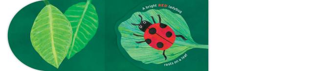 A unique format, this board book has two spines—one on each side. Every other page attaches to the opposing spine so that the book opens outward left and right. As the the reader turns the pages (each die-cut in the shape of a leaf), a new colorful bug appears.