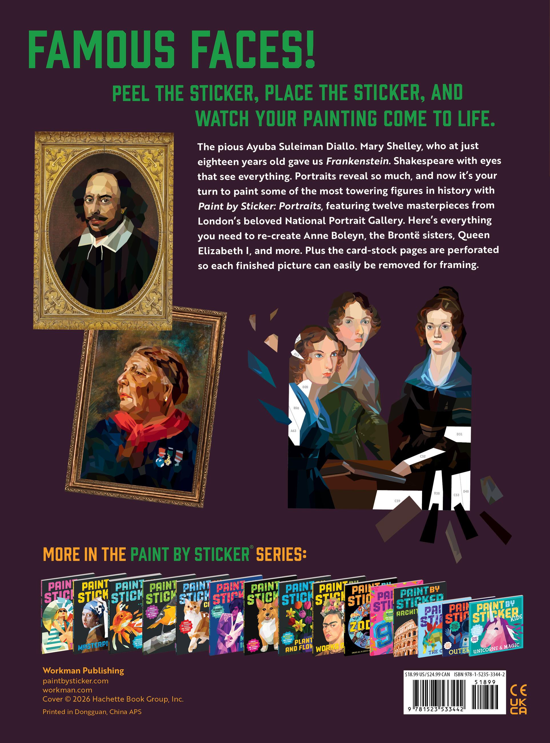 Peel the sticker, place the sticker, and watch your artwork come to life! Featuring select pieces from the renowned collection at London’s National Portrait Gallery, Paint By Sticker: Portraits includes everything you need to create 12 paintings of historically significant British figures such as Shakespeare, Ira Alridge, the Brontë sisters, Mary Seacole, and more. Plus the card-stock pages are perforated, so every finished picture can easily be removed for framing.