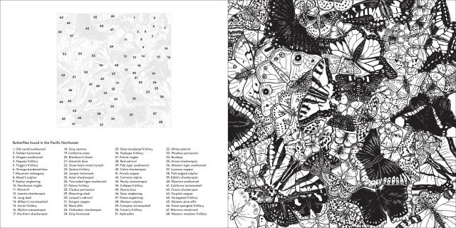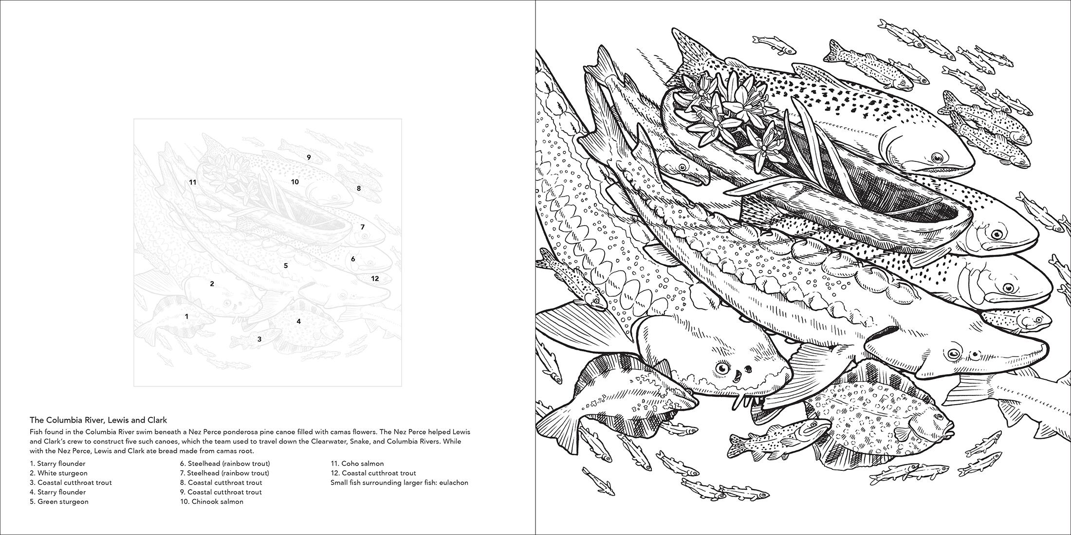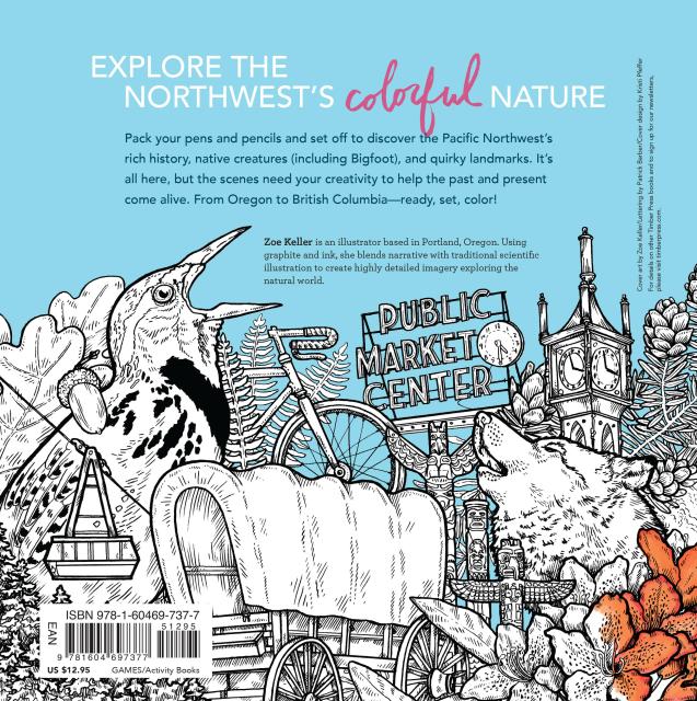 “Color the Pacific Northwest is an inky exploration of the people, places, plants, and popular culture that define Oregon, Washington, and British Columbia, traveling through old growth forests, mountain meadows and quirky cities. Readers can color their own Sasquatch, ink their own latte art, and fill in the details of an intricate family of salmon. They'll take a journey on the Oregon Trail, catch a flying fish from Seattle's Pike Place Market, and go whale watching in Vancouver using only their colored pencils.”